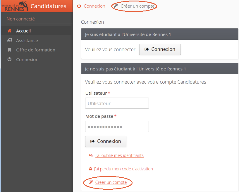Dans l'encadré "Je ne suis pas étudiant à l'Université de Rennes", cliquez sur le bouton "Créer un compte"